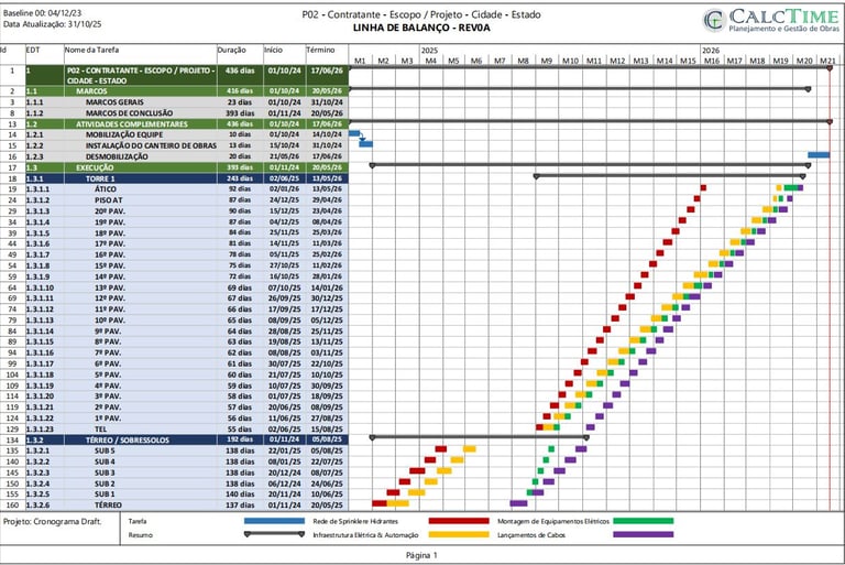 Enquanto o cronograma de barras (Gantt) mostra quando cada atividade ocorre, a Linha de Balanço mostra como elas se movimentam ao longo do tempo e do espaço.