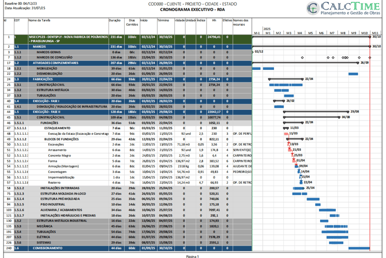 Referenciado ao Cronograma Físico-Financeiro de Proposta e Projetos Executivos, incluindo todas as etapas de suprimentos, fabricação e montagem